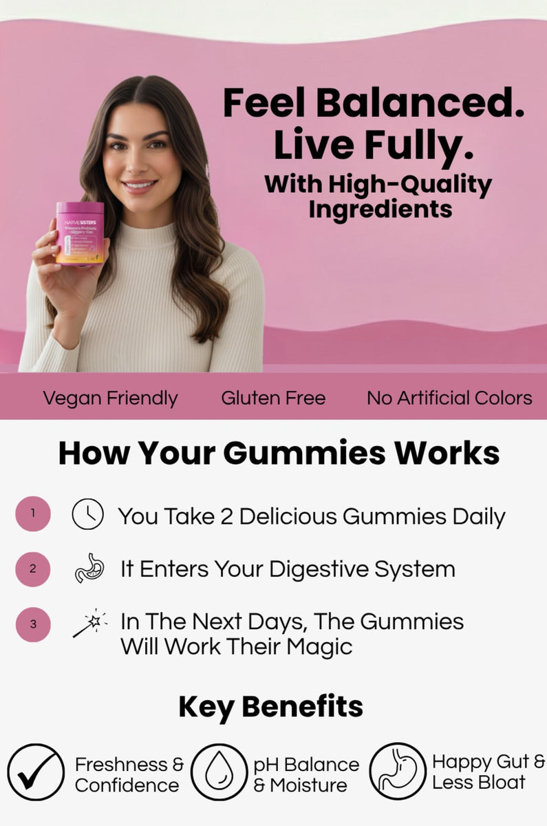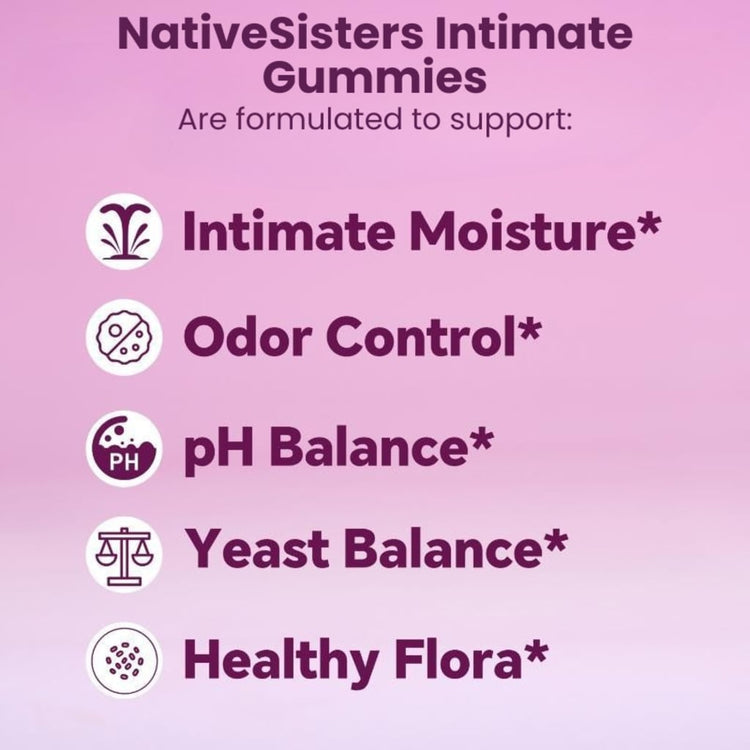 Tome dos gomitas al día con agua, preferiblemente con una comida, para apoyar su rutina de salud digestiva e íntima.